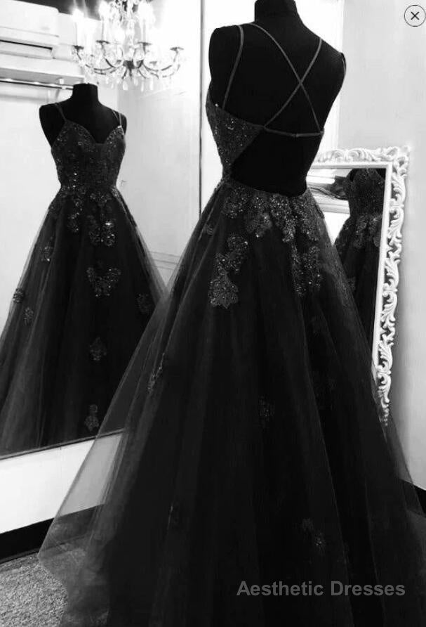 A Line Floor Length Black Tulle Lace Prom Dresses