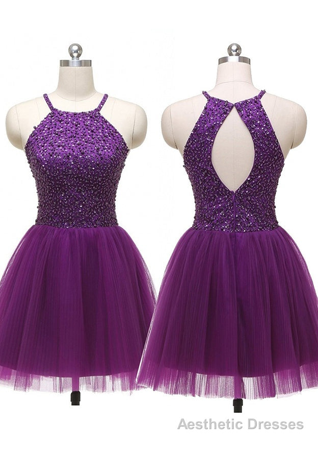 A-line Halter Sleeveless Tulle Short/Mini Homecoming Dress With Beading Pleated Sequins