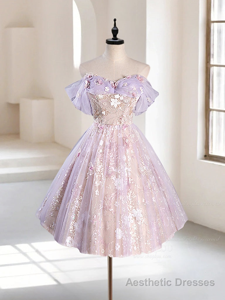 A-Line Off Shoulder Tulle Lace Purple Short Prom Dress, Cute Purple Homecoming Dress