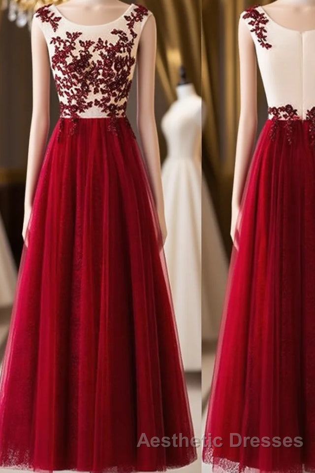 A Line Round Neck Burgundy Lace Tulle Long Evening Prom Dresses, Burgundy Lace Evening Dresses, Burgundy Lace Graduation Dresses