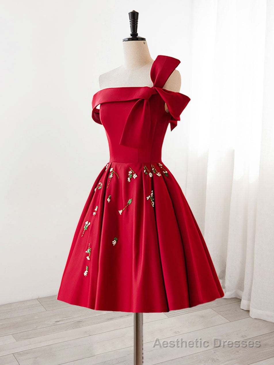 A-Line Satin Burgundy Short Prom Dress, Burgundy Homecoming Dress with Beading