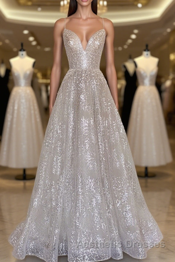 A line sequin long Evening Prom Dresses, champagne sequin evening Dresses