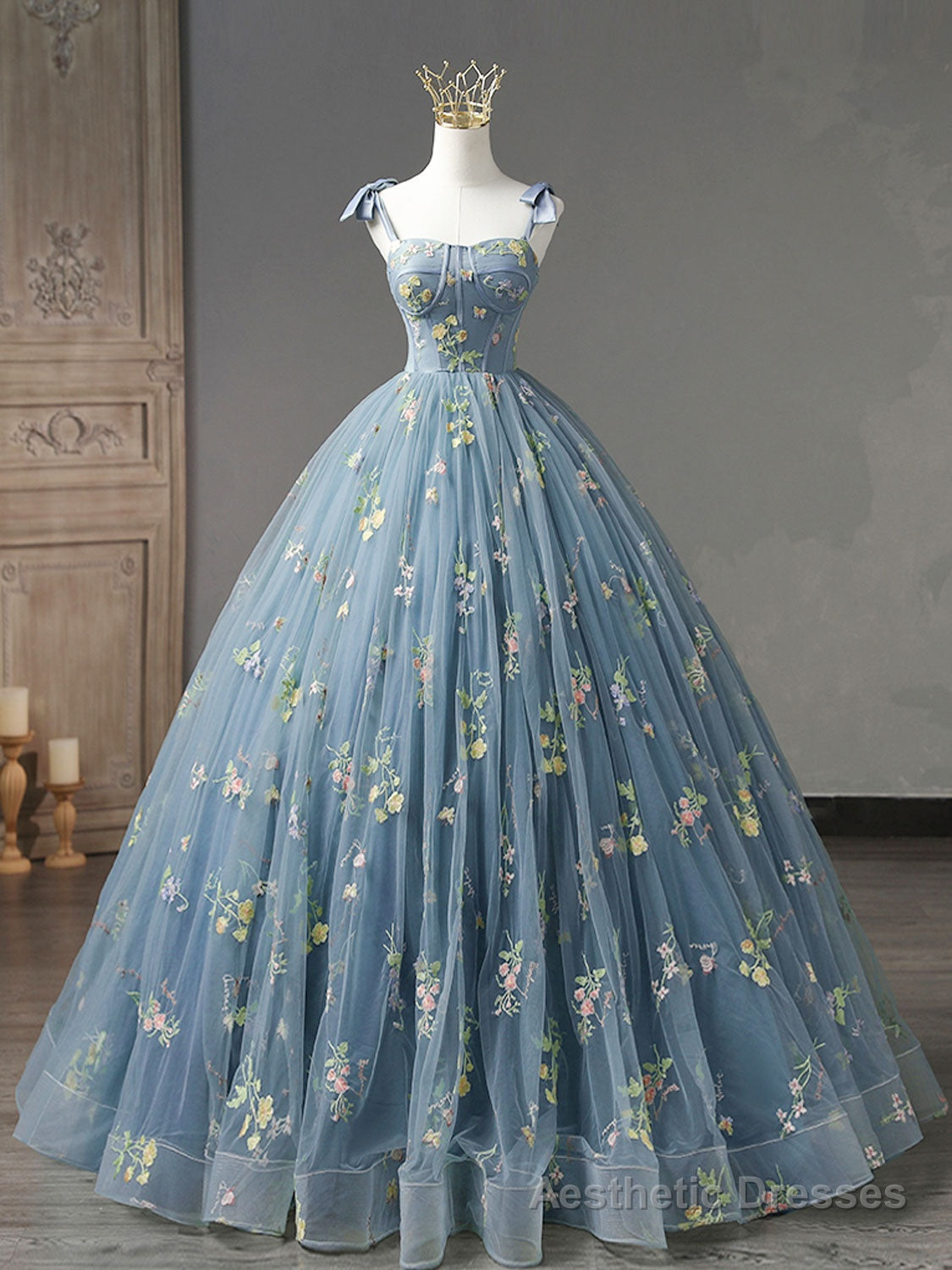 A-Line Sweetheart Neck Lace Gray Blue Long Prom Dress, Gray Blue Sweet 16 Dress