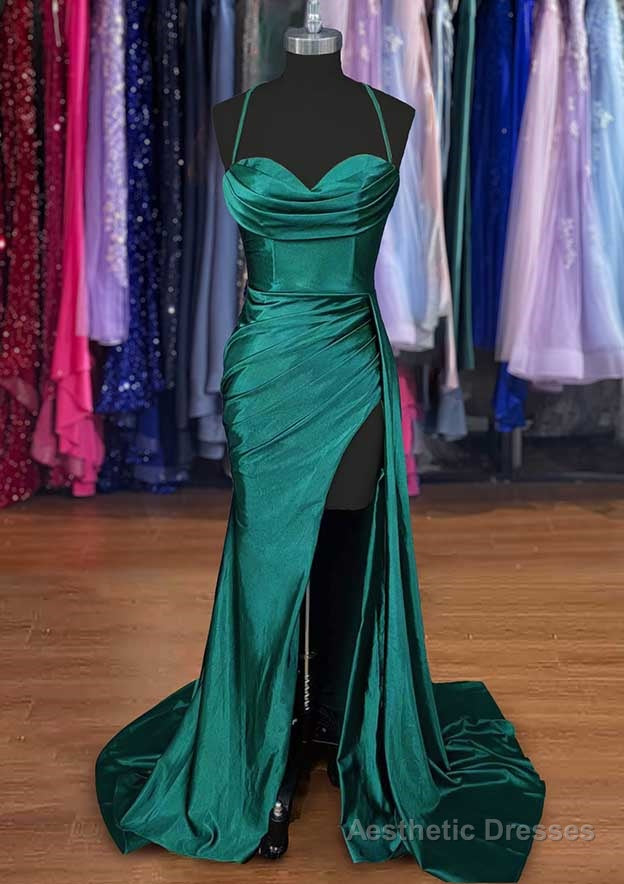 A-line Sweetheart Spaghetti Straps Sweep Train Silk like Satin Ruched Prom Dress- Prom Dresses