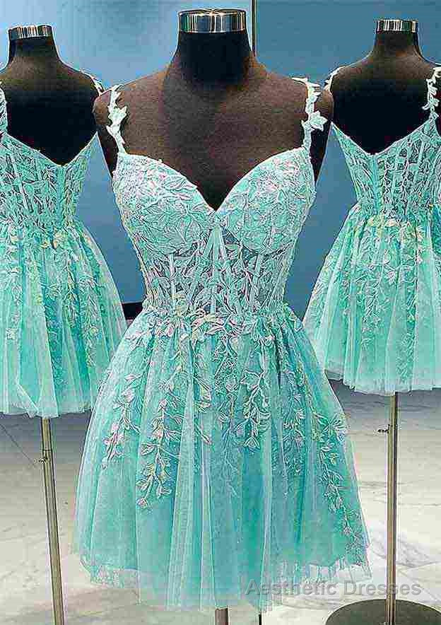 A-line V Neck Sleeveless Short/Mini Lace Prom Dress With Beading