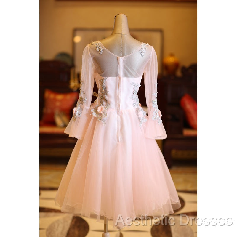 Adorable Pink Tulle Knee Length Long Sleeves Party Dresses, Pink Homecoming Dresses