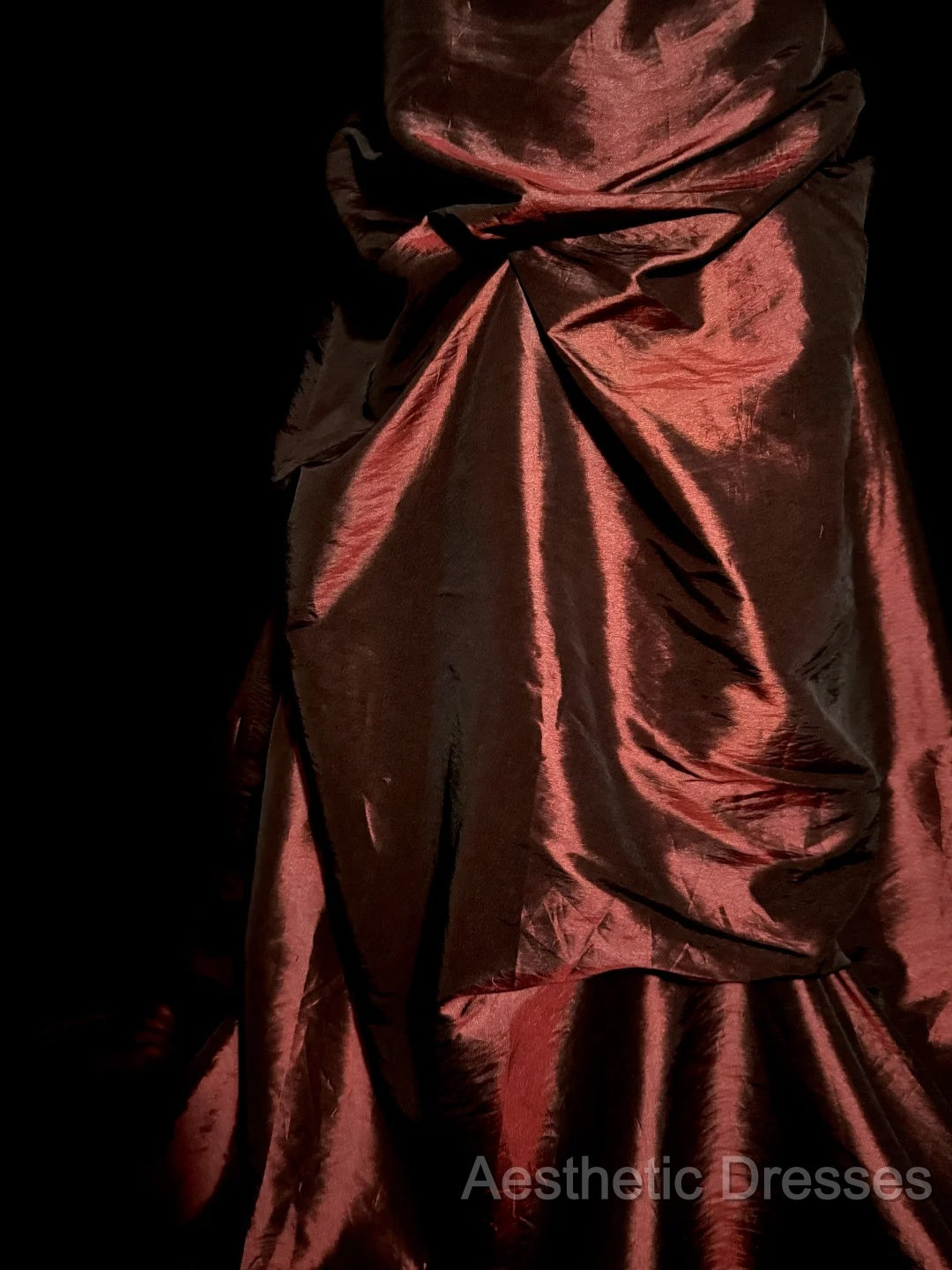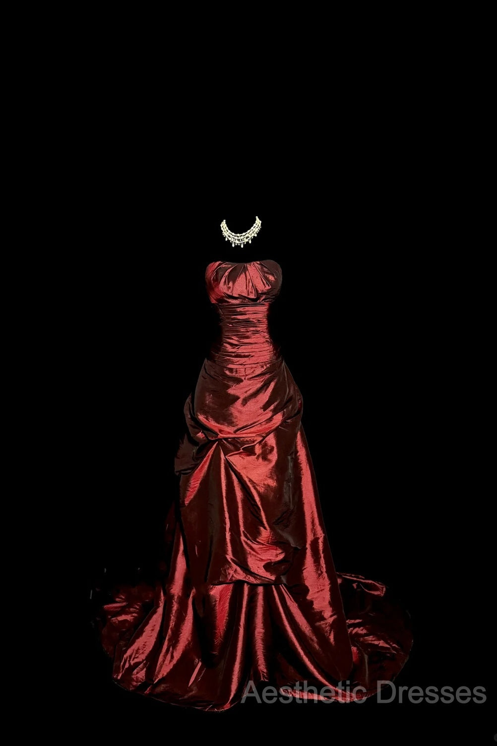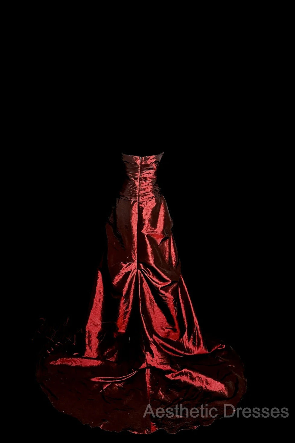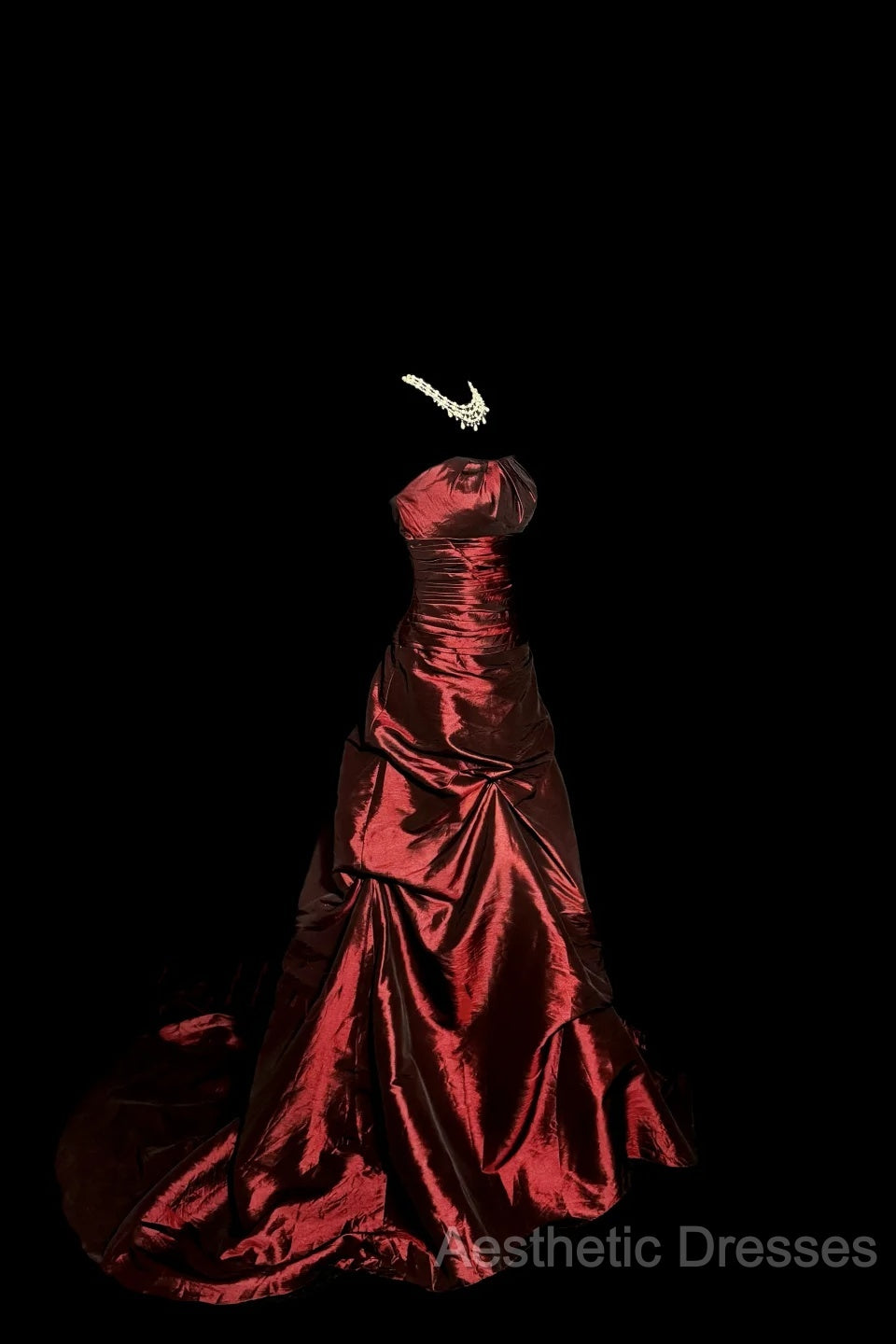 Aesthetic Ball Gown Strapless Burgundy Taffeta Evening Prom Dresses Ruffle Long Party Dresses