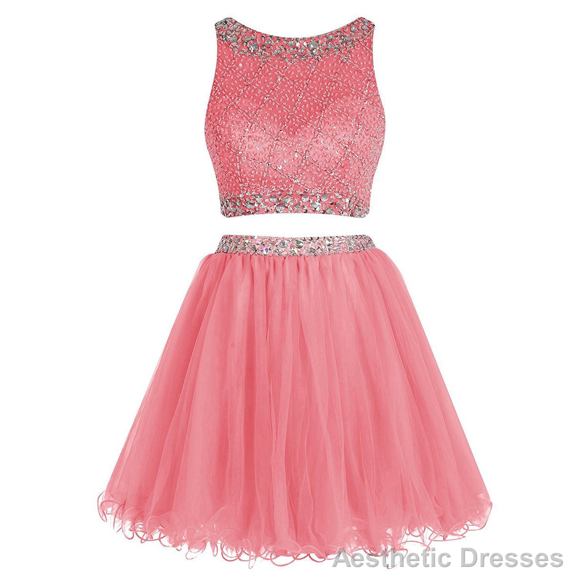 Bateau Neck Illusion Pink Short Crystal Beaded Two Piece Sequined Crop Top Tulle Mini Prom Dresses