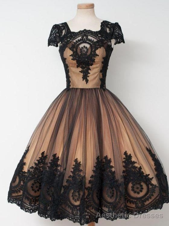 Black Lace Short Vintage Prom Dress with Cap Sleeves