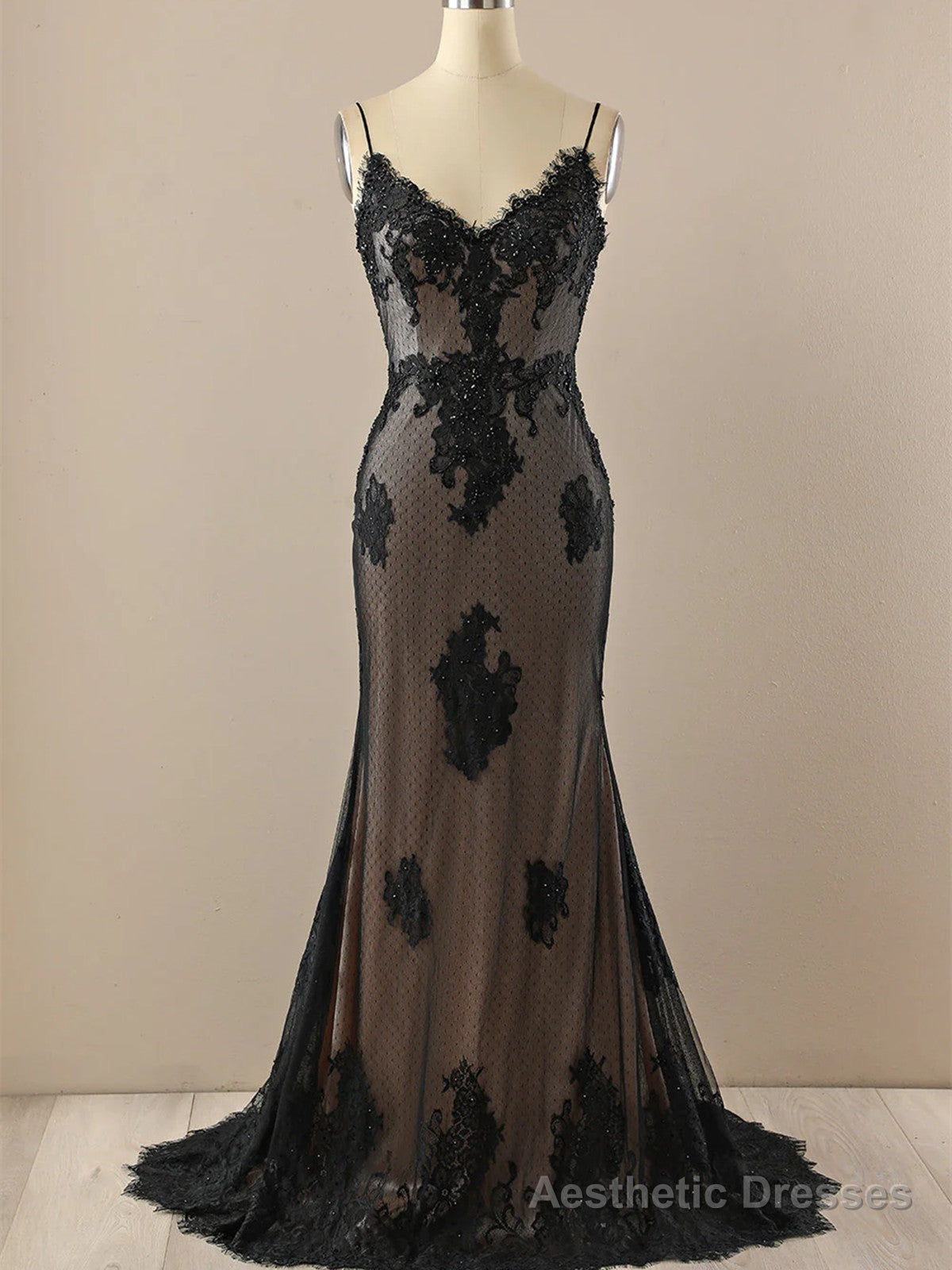 Black Mermaid Lace Straps Evening Dress Party Dress, Black Long Prom Dress