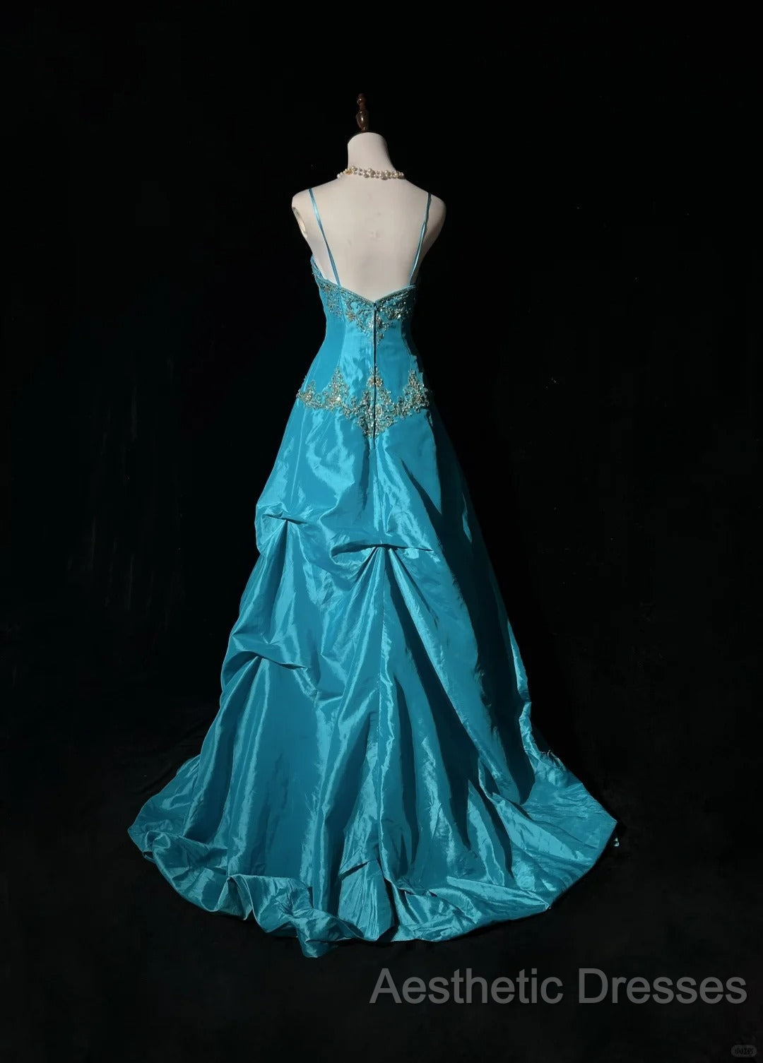 Blue A-Line Spaghetti Straps Satin Beaded Long Evening Prom Dresses Sweetheart Neck Applique Graduation Evening Prom Dresses