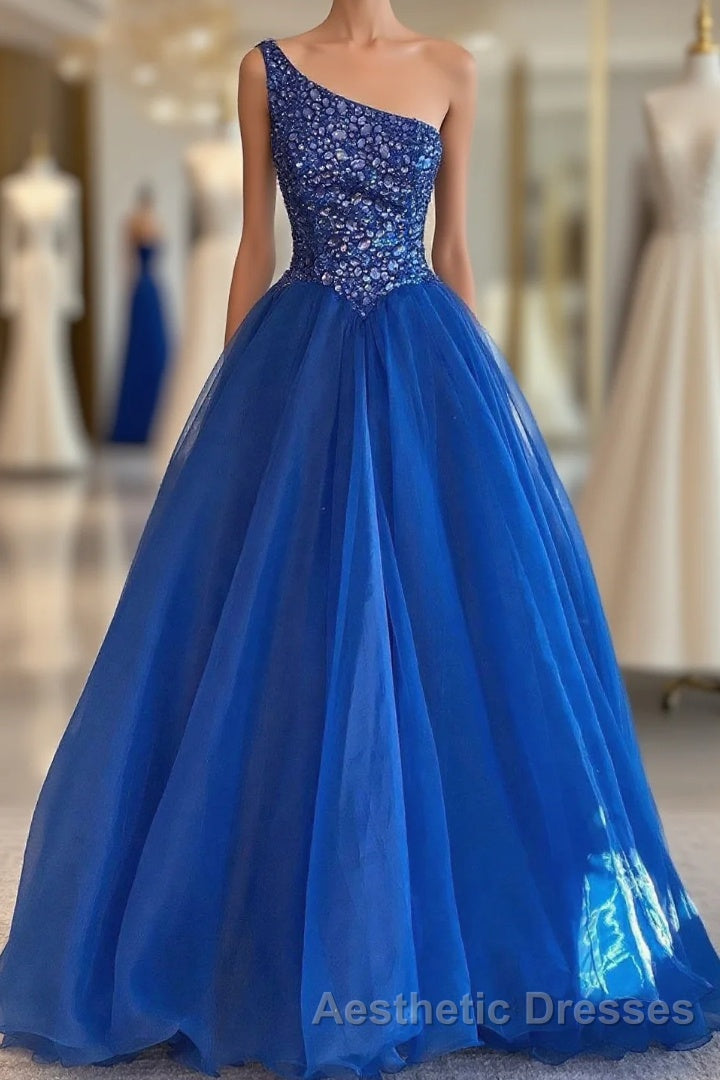 Blue Beaded One-Shoulder A-Line Long Evening Prom Dresses