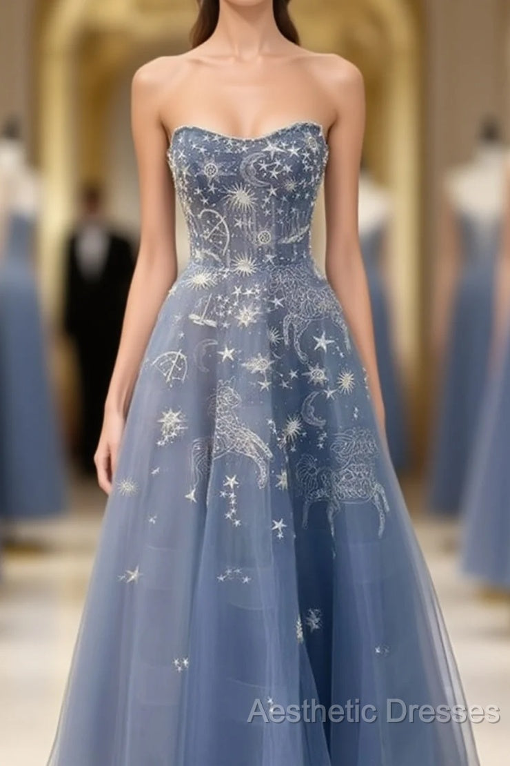 Blue Embroidery Tulle Dresses