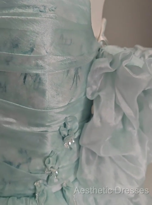 Blue Floral A-Line Strapless Organza Long Evening Prom Dresses Graduation Evening Prom Dresses