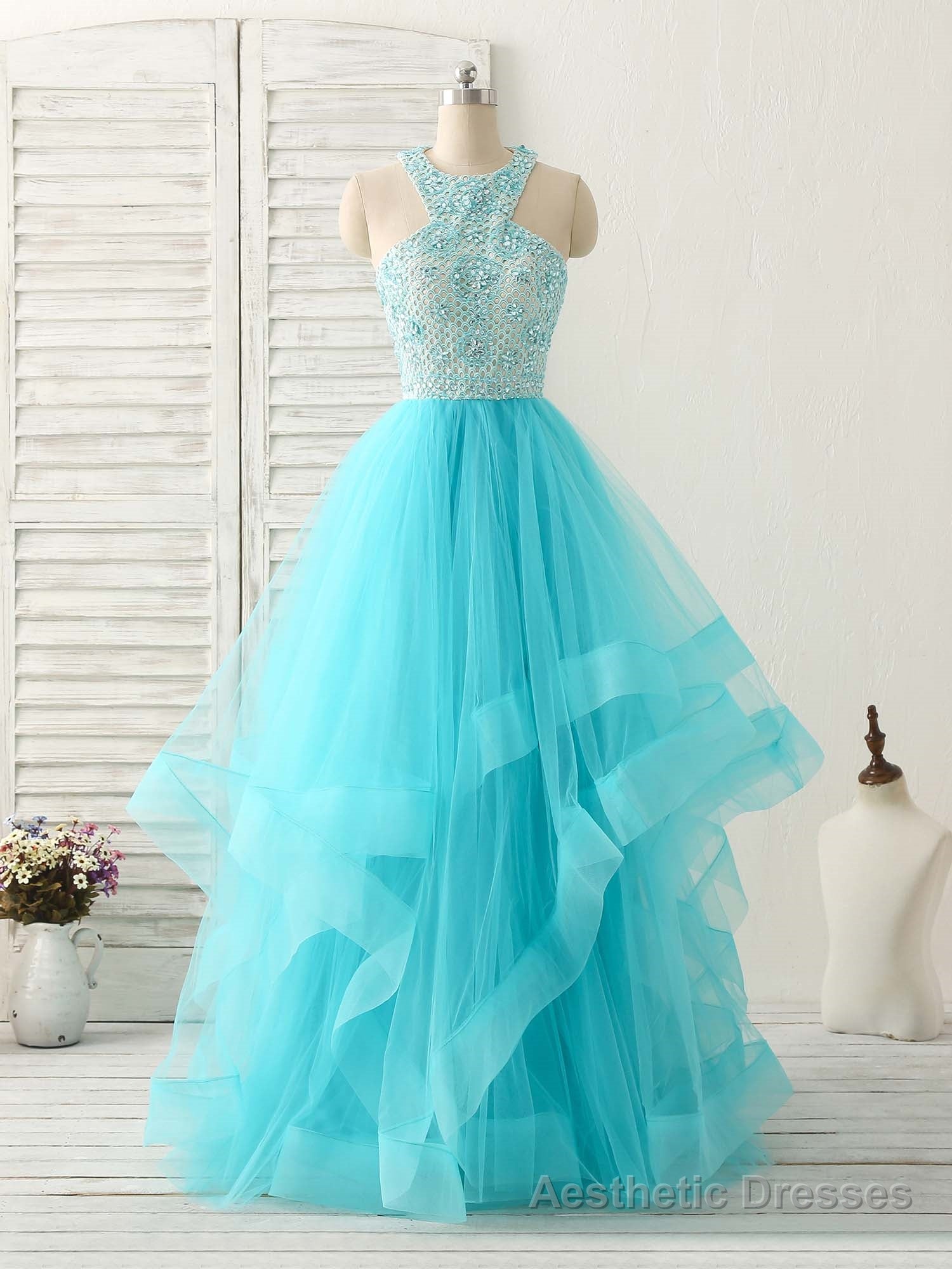 Blue High Neck Tulle Long Prom Dress Blue Evening Dress