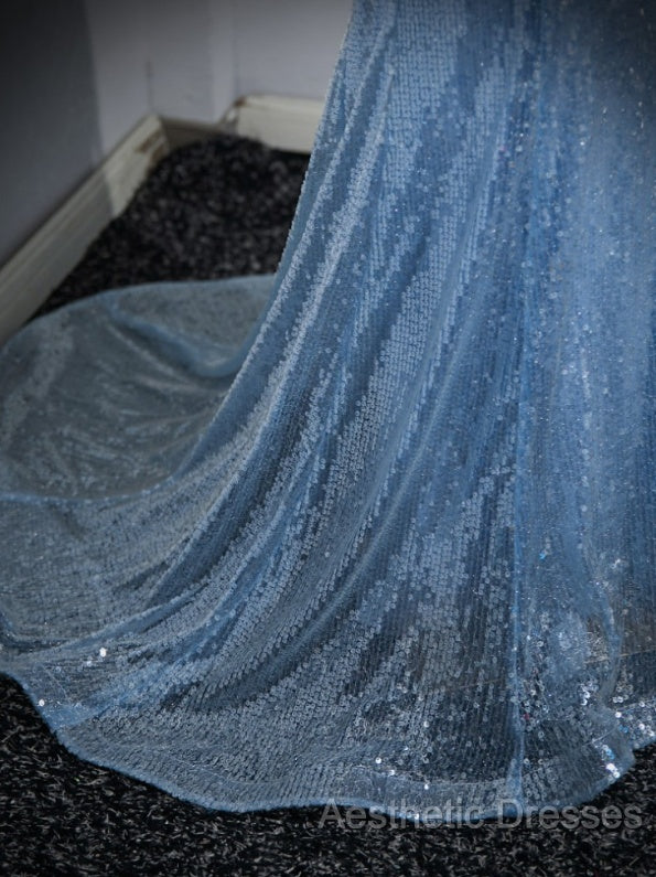 Blue Mermaid Sequin Sheer Straps Scalloped Long Evening Prom Dresses
