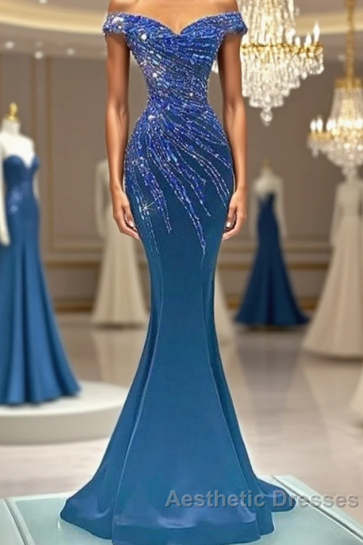 Blue Robe De Soiree Mermaid Off The Shoulder Beaded Crystals Long Evening Prom Dresses Evening Prom Gown Evening Dresses