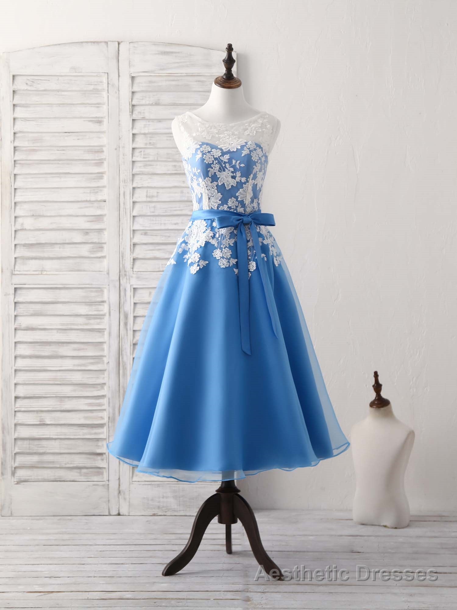Blue Round Neck Tulle Lace Applique Tea Long Prom Dress, Bridesmaid Dress