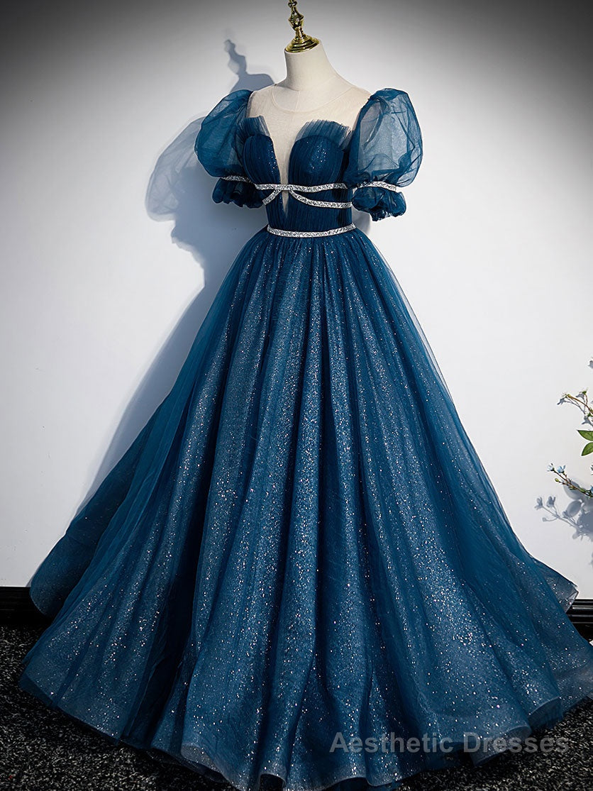 Blue Tulle Off Shoulder Long Prom Dress, Blue Tulle Formal Dress