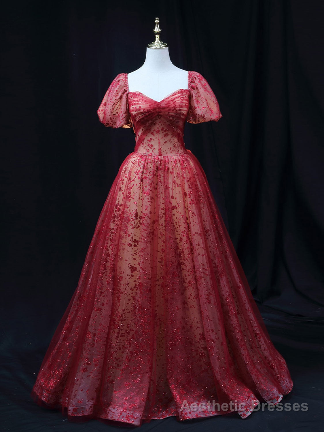 Burgundy A line Tulle Sequin Long Prom Dress Burgundy Tulle Formal Evening Dress