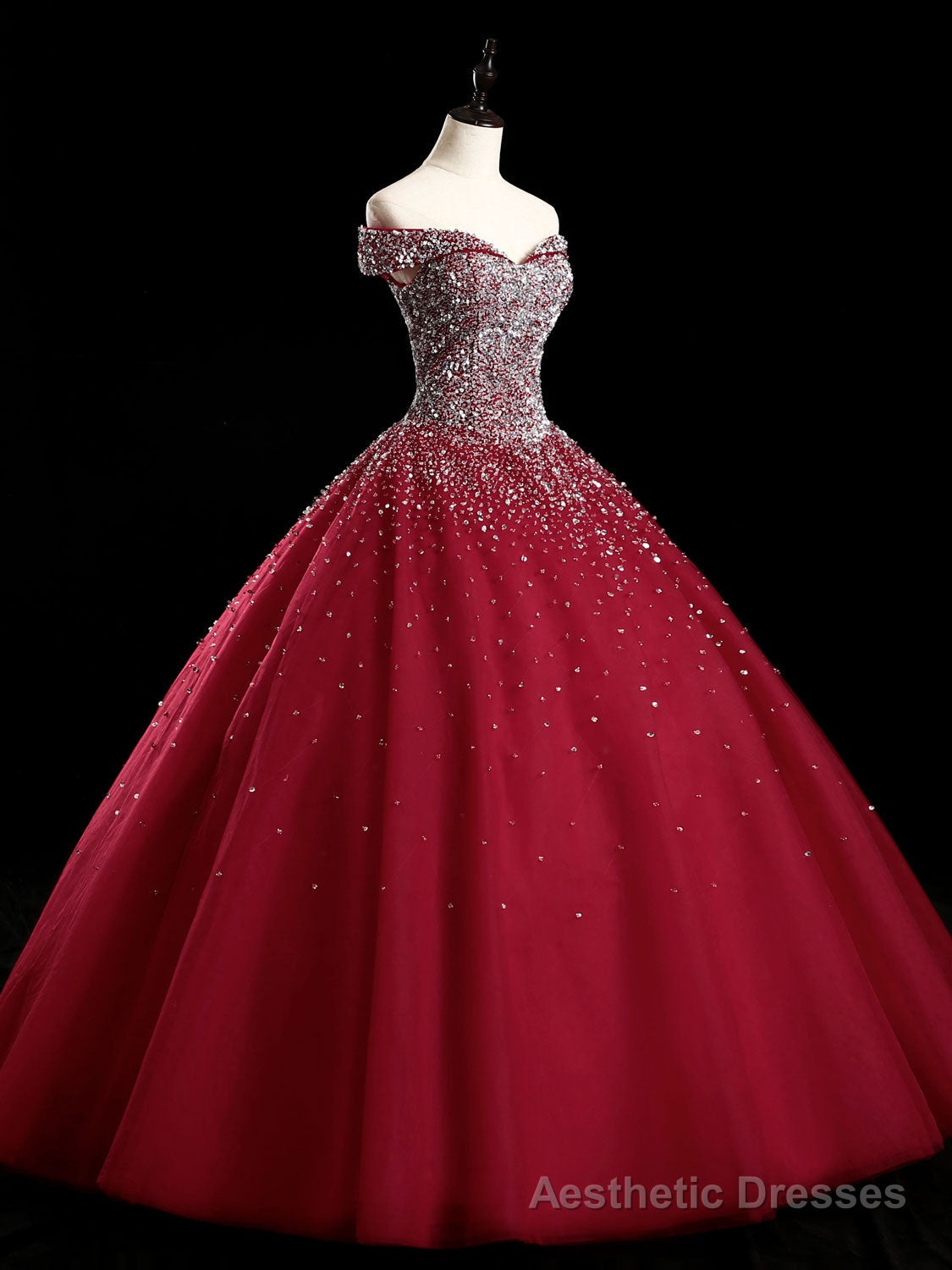 Burgundy Off Shoulder Tulle Sequin Long Prom Dress, Burgundy Sweet 16 Dress