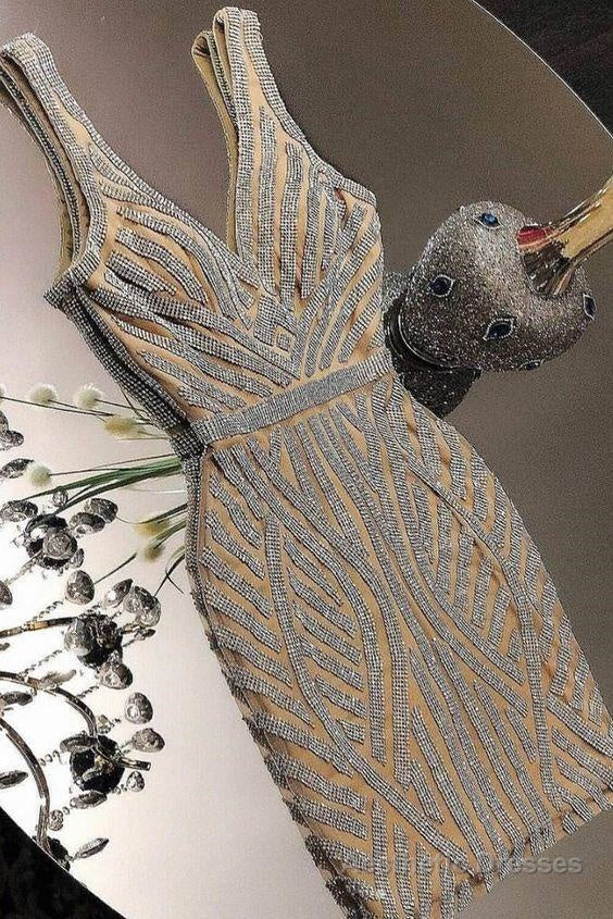 Champagne Beads Short Prom Dress, Champagne Evening Dress