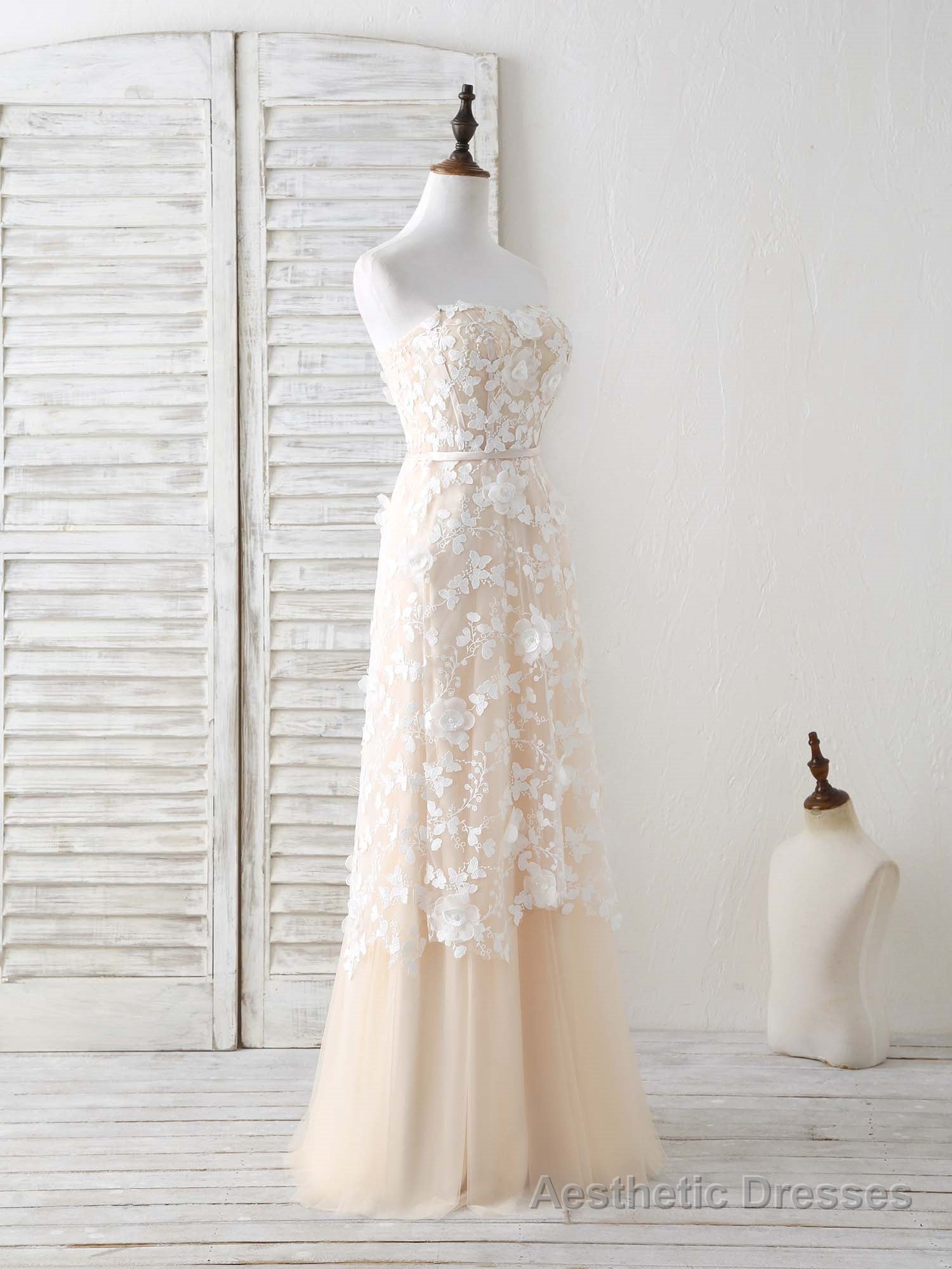 Champagne Tulle Lace Applique Long Prom Dress Champagne Evening Dress