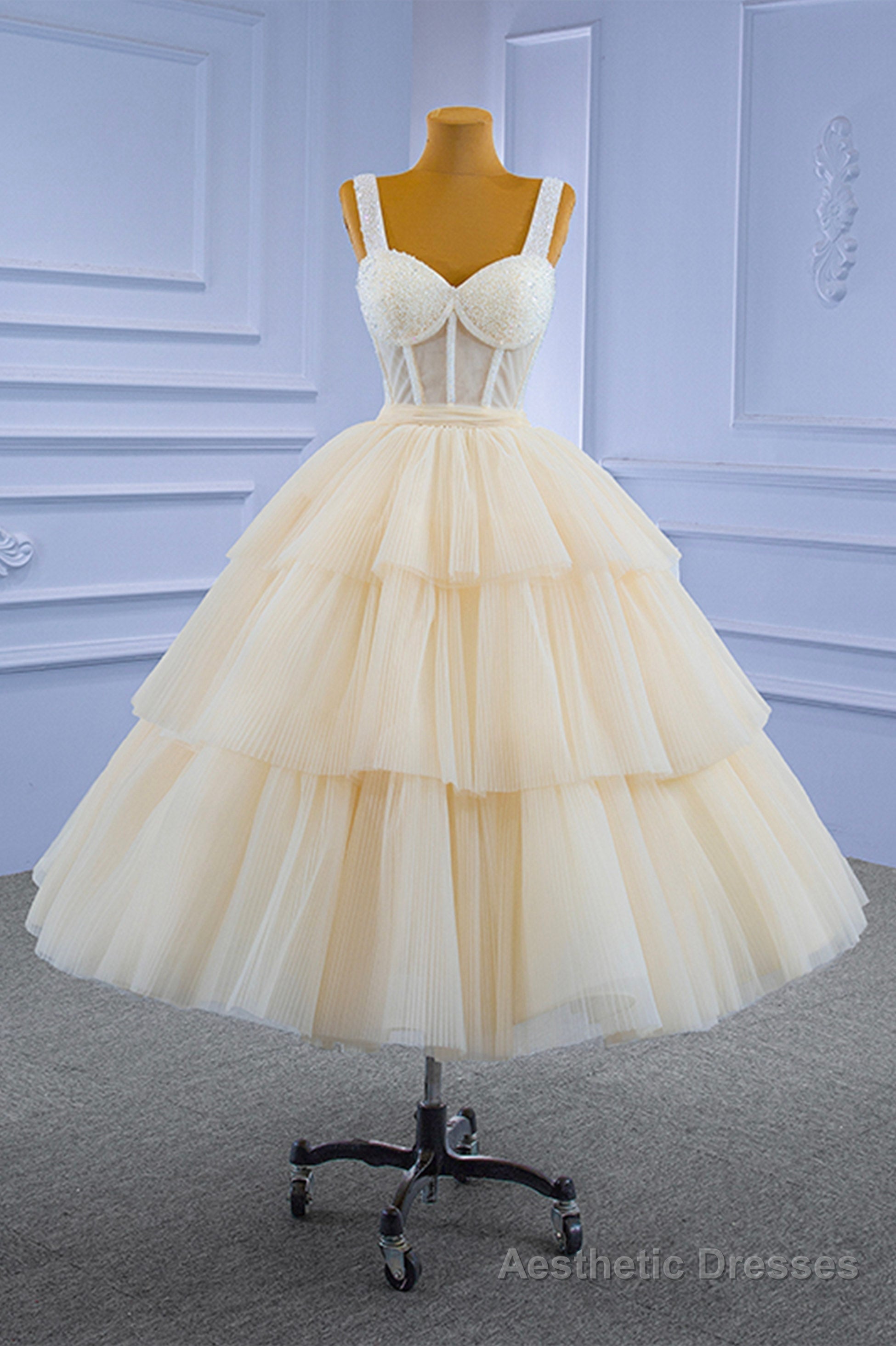 Champagne Tulle Short Prom Dress with Beaded, A-Line Tea Length Party Dress