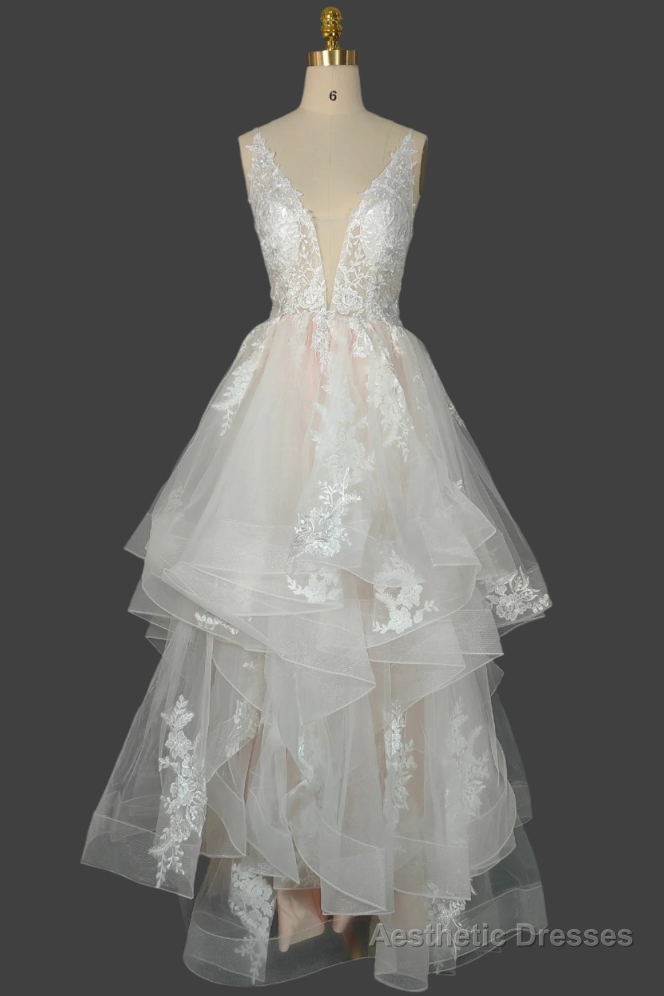 Champagne V-Neck Long Prom Dresses A-Line Tulle Formal Evening Dresses