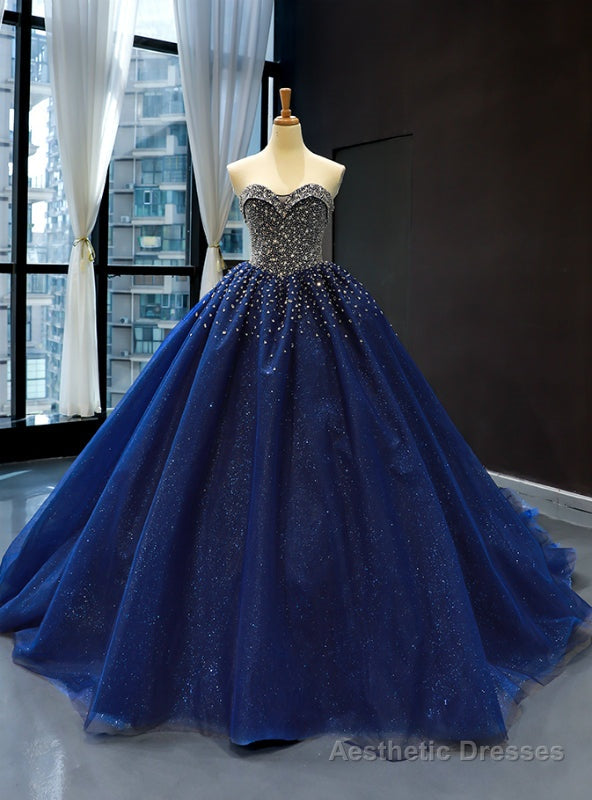 Dark Blue Tulle Sweetheart Beading Sequins Haute Couture Prom Dresses