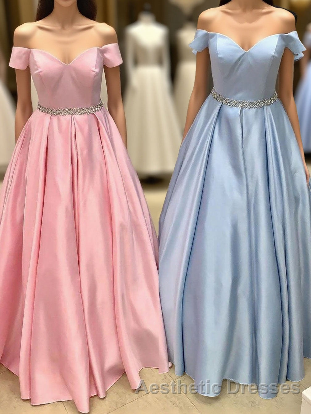 Elegant Off the Shoulder Satin Beaded Long Evening Prom Dresses