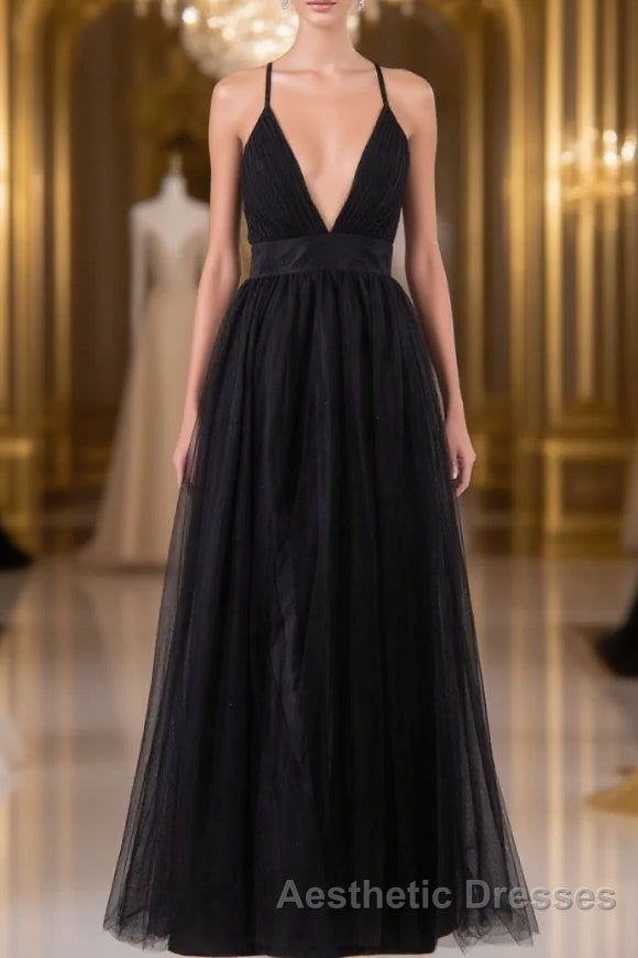 Elegant Tulle Spaghetti Straps Backless Floor Length Evening Prom Dresses