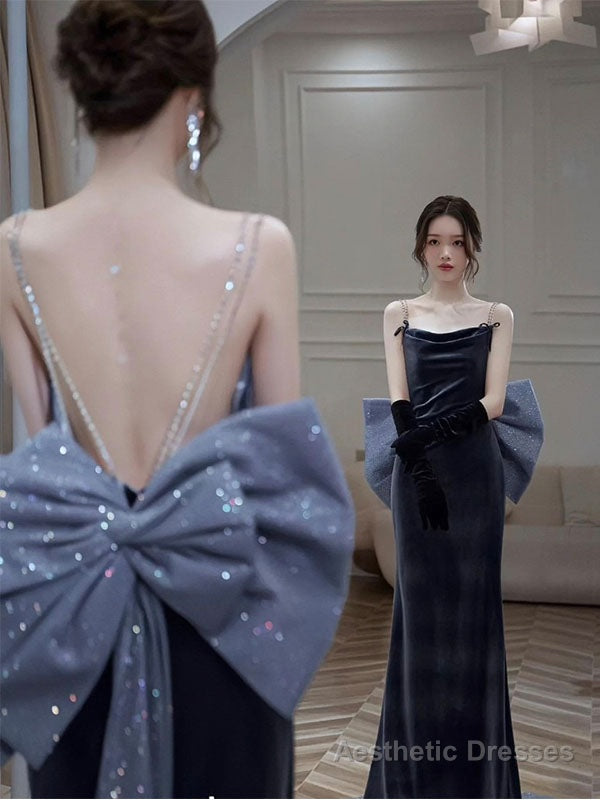 Elegant Velvet Spaghetti Straps Backless Sheath Long Prom Dresses Evening Dress With Bowknot