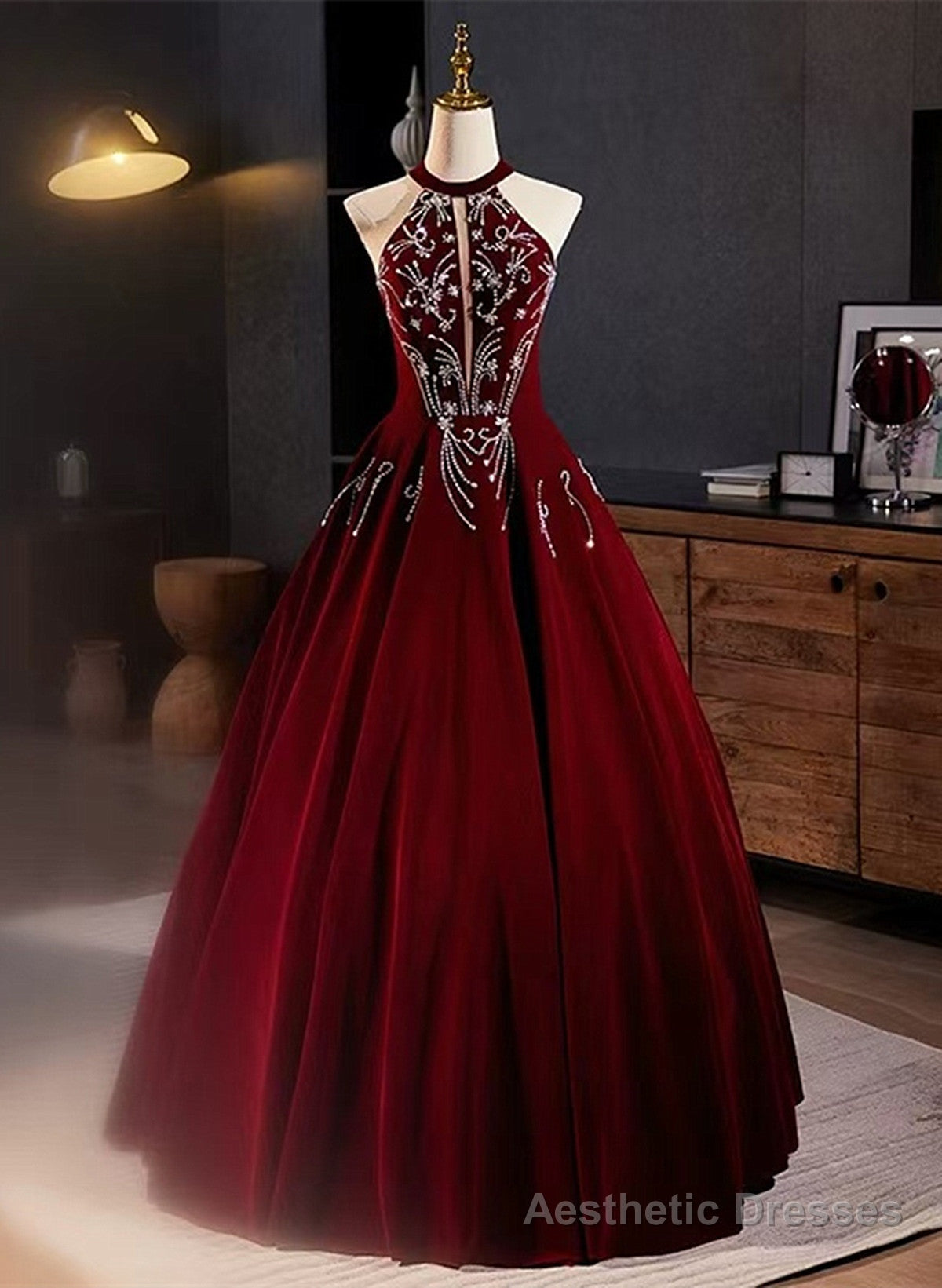 Glam Wine Red Beaded Velvet Halter Evening Dress, Wine Red Velvet Prom Dress