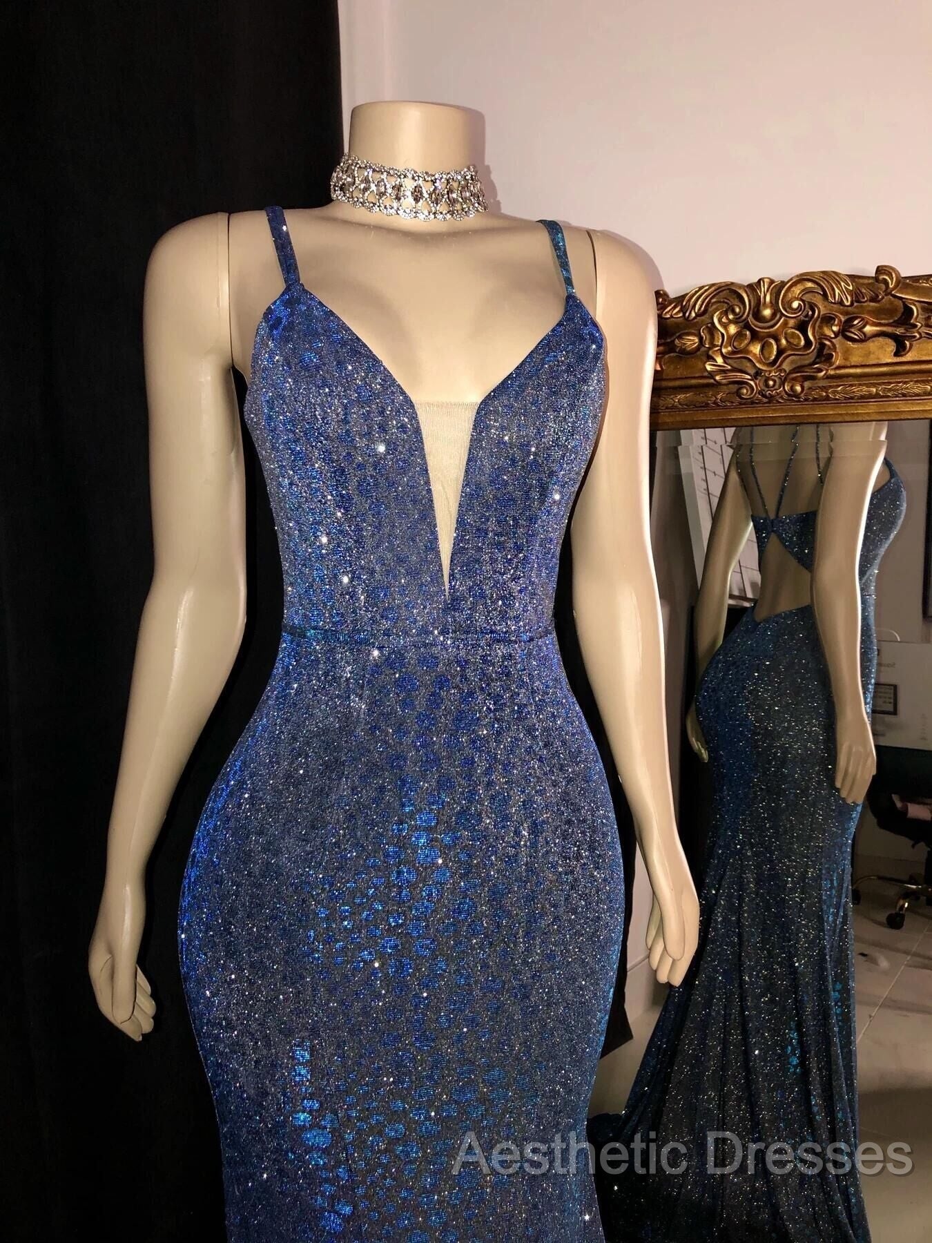 Glitter Mermaid Evening Prom Dresses Long Spaghetti Straps V Neck Open Back Formal Evening Party Gowns