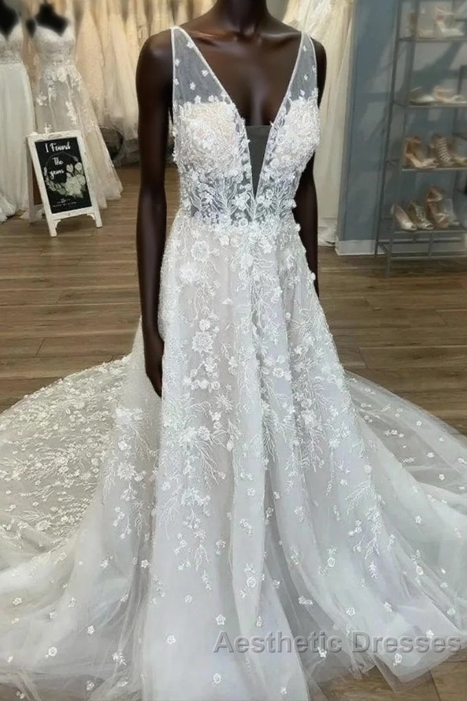 Gorgeous A-Line Deep V-Neck Open Back Chapel Train Wedding Dresses