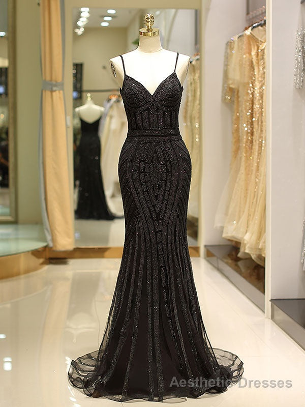 Gorgeous Black Evening Dresses Mermaid Luxury Heavy Beaded Straps Long Formal Evening Dress