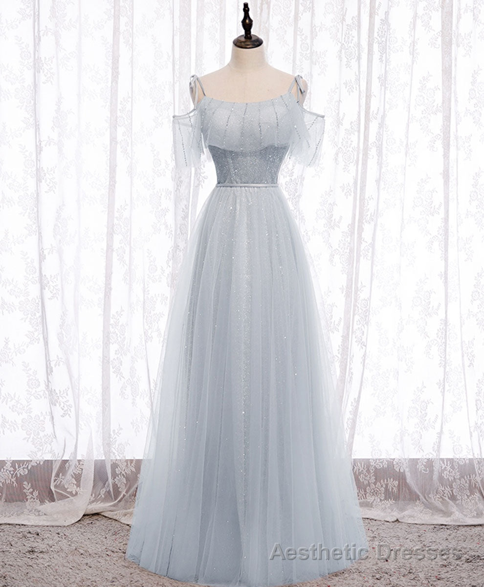 Gray A line Tulle Long Prom Dress, Gray Formal Bridesmaid Dress