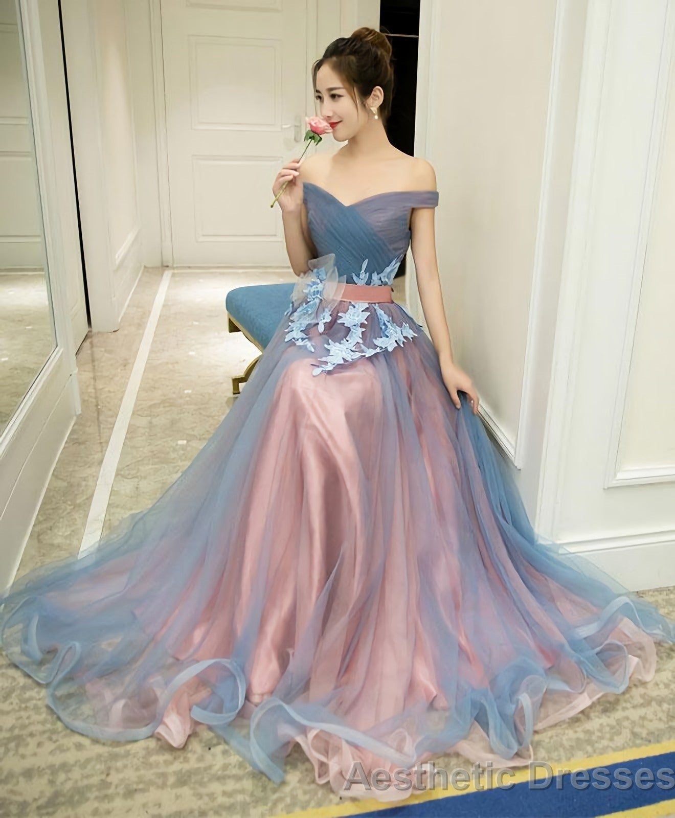 Gray Blue Tulle Off Shoulder Long Prom Dress Gray Blue Evening Dress