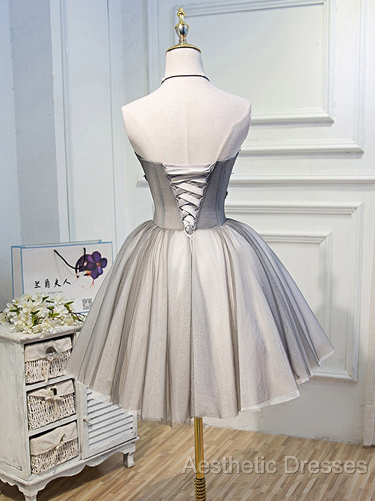 Gray Sweetheart Neck Tulle Lace Short Evening Prom Dresses, Cute Homecoming Dresses