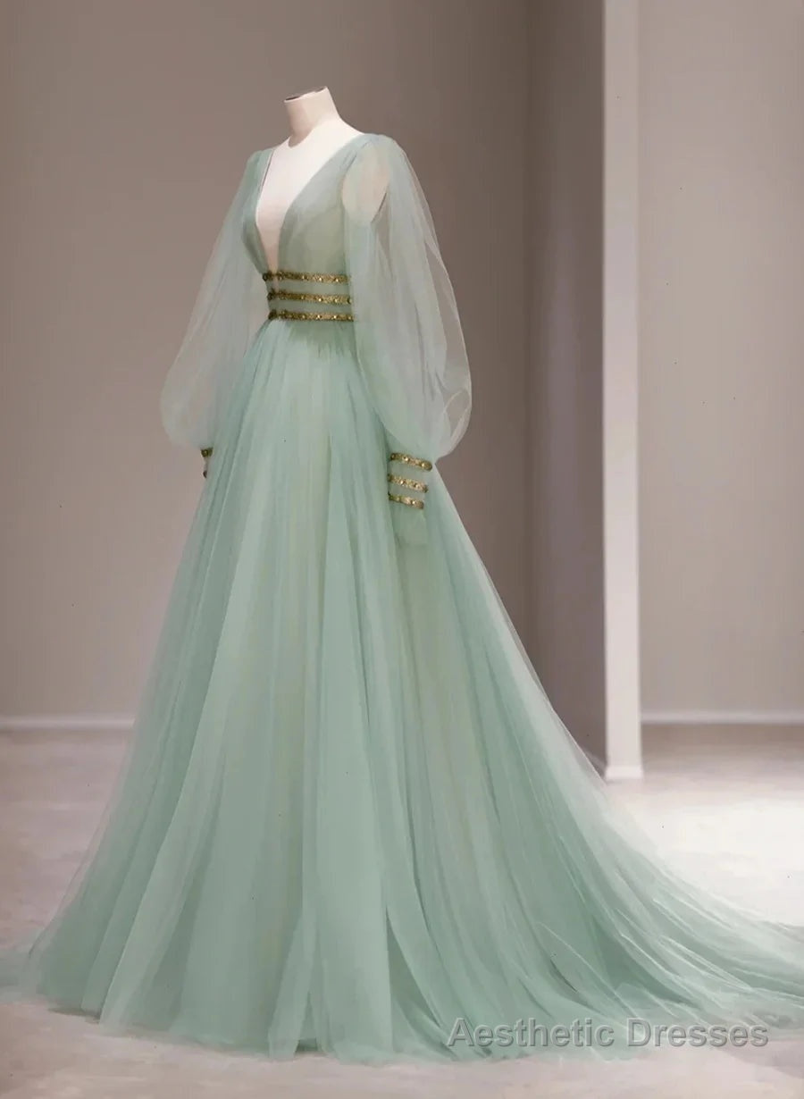 Green A-line Tulle New Prom Dress Long Sleeves Green Party Dress prom dresses shops