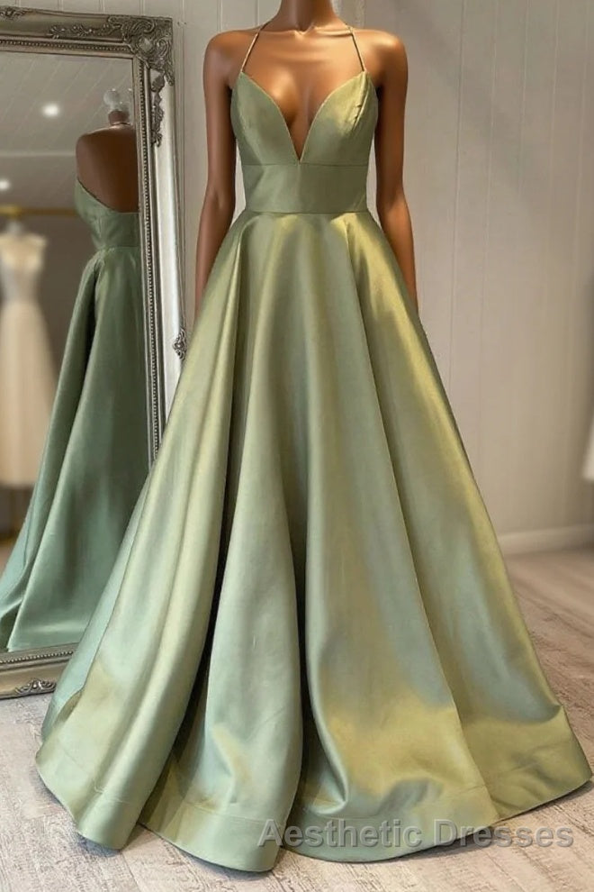 Green Simple A Line Satin Spaghetti Straps Long Evening Prom Dresses