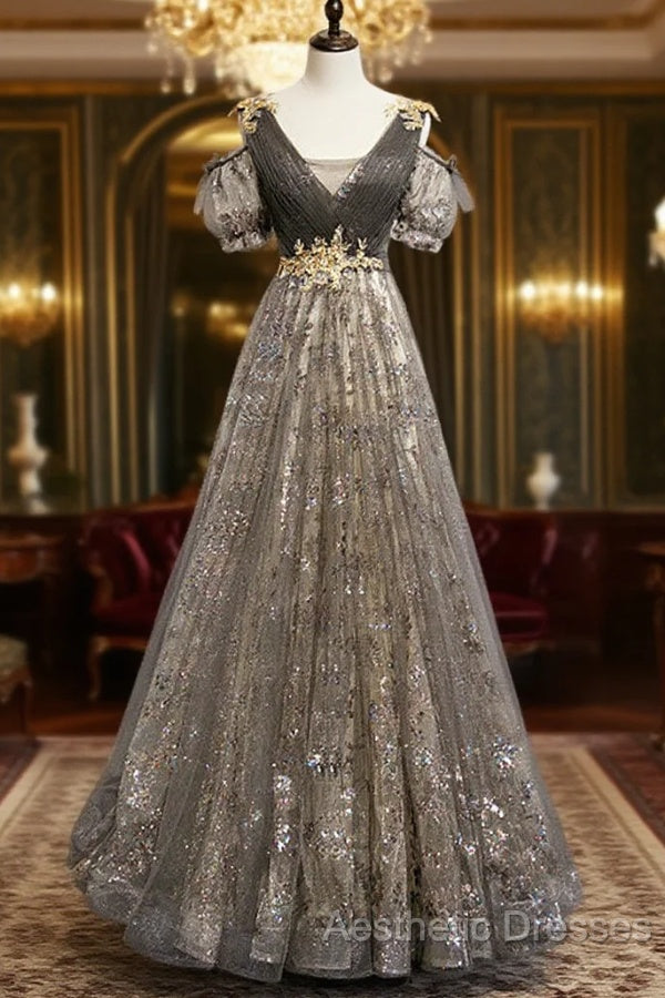 Grey Purple V-Neckline Tulle With Lace Evening Prom Dresses, Off Shoulder A-Line Party Dresses