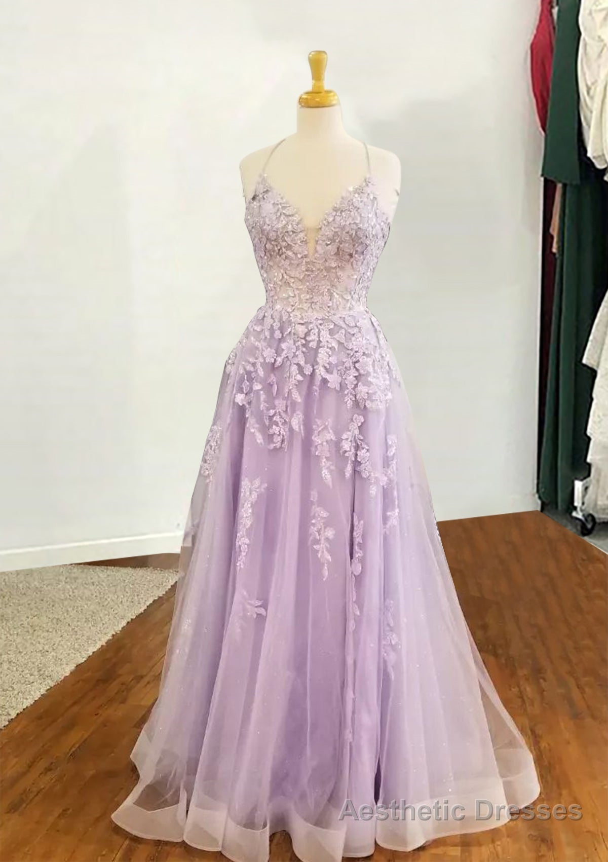 Lilac Prom Dresses, A-line V Neck Spaghetti Straps Long/Floor-Length Tulle Prom Dress With Appliqued Sequins