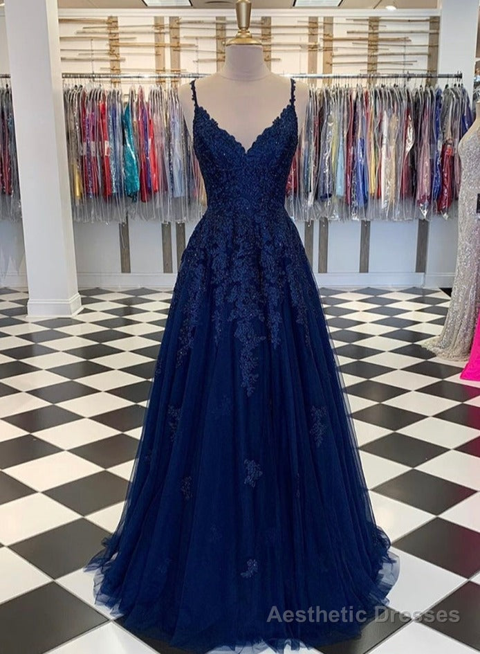 Navy Blue A-Line V-neck Floor-Length Chiffon Prom Dresses With Lace Sequins