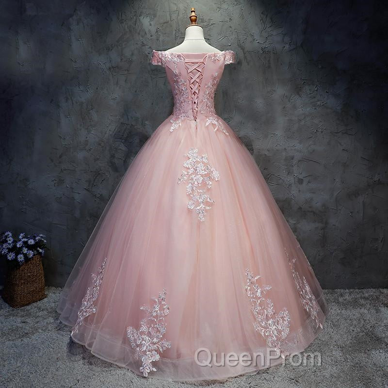 Pink Cap Sleeves Ball Gown Tulle With Lace Sweet 16 Evening Prom Dresses, Long Quinceanera Dresses