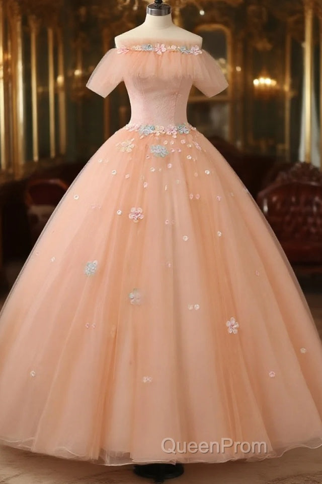 Pink Flowers Tulle Off Shoulder Party Dresses, Pink Tulle Sweet 16 Dresses