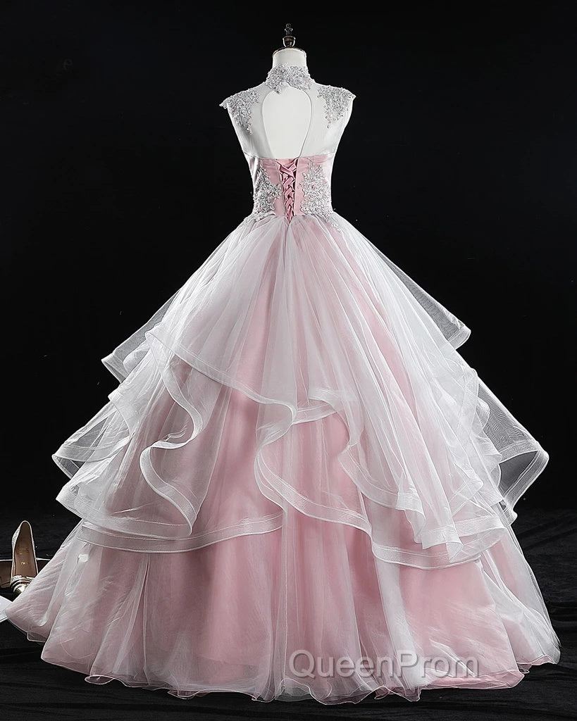 Pink High Neck Tulle Lace Long Evening Prom Dresses, Pink Sweet 16 Gown