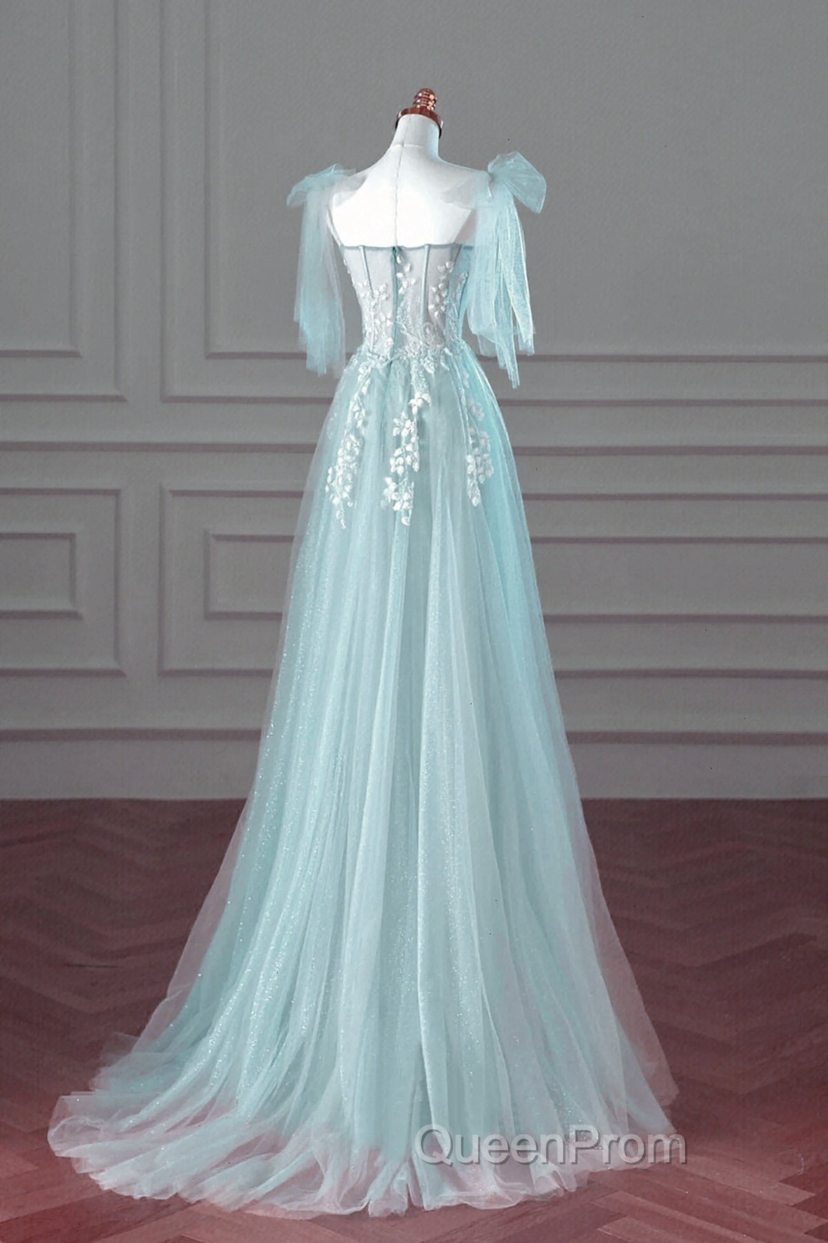 Pretty Mint Blue Tulle With Lace A-Line Long Party Dresses, Mint Blue Evening Prom Dresses Fornal Dresses
