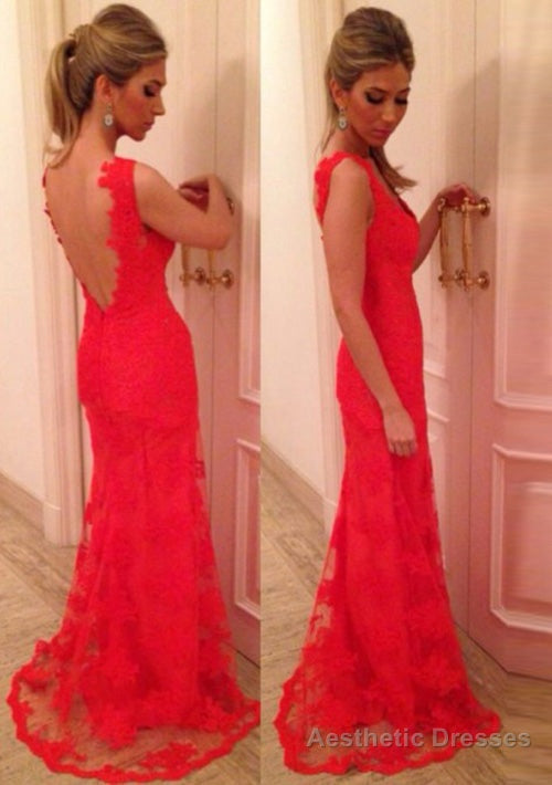 Red Prom Dresses, Sheath/Column V Neck Sleeveless Sweep Train Lace Prom Dress With Appliqued